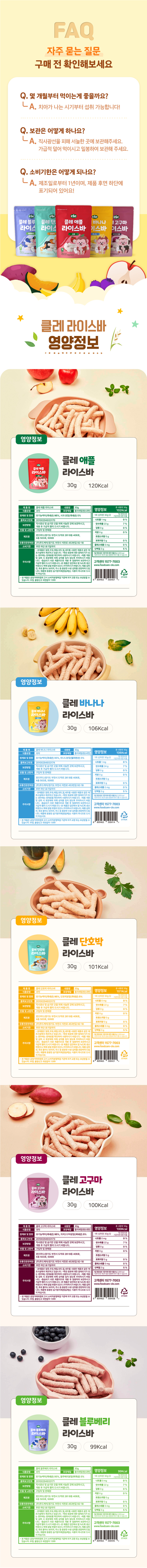 | 원재료명 및 함량 | 애플라이스바:유기농백미(국내산) 95%, 사과분말(국내산) 5% 바나나라이스바:유기농백미(국내산) 95%, 바나나분말(필리핀산) 5% 단호박라이스바:유기농백미(국내산) 95%, 단호박분말(국내산) 5% 고구마라이스바:유기농백미(국내산) 95%, 자색고구마분말(국내산) 5% 블루베리라이스바:유기농백미(국내산) 95%, 블루베리분말(미국산) 5% |