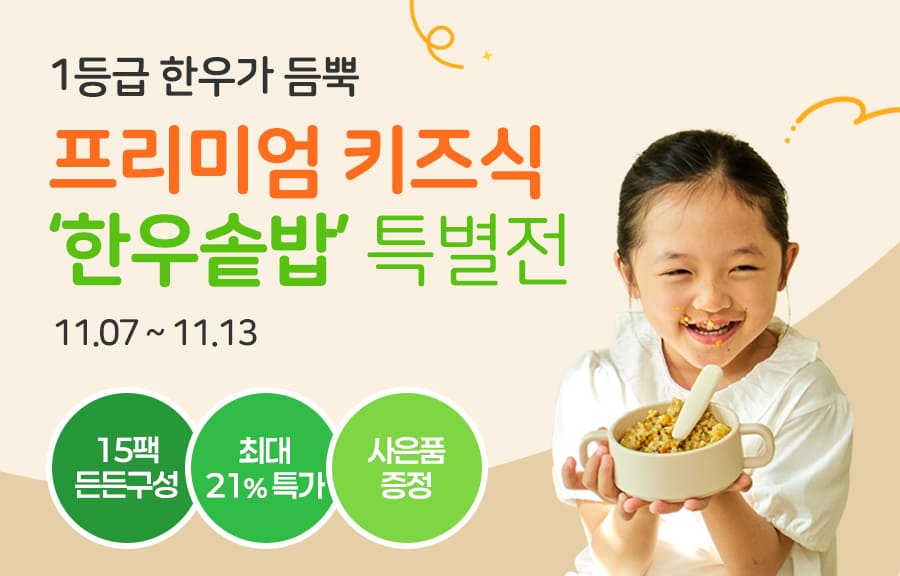 | 원재료명 및 함량 | [한우오리지널] 유기농 쌀(국내산) 33.26%, 쇠고기(국내산/한우) 15.8%, 단호박(국내산)8.32%, 당근(국산)8.32%, 양파(국산)7.28%, 대파(국산)7.28%, 느타리버섯(국산)3.33%, 마늘(국산)1.29%, 생강즙0.17%, 정제수14.97% [한우곤드레] 유기농 쌀(국내산) 34.07%, 쇠고기(국내산/한우) 13.63%, 곤드레(국산) 6.81%, 양파(국산)8.3%, 대파(국산) 8.3%, 무(국산) 7.67%, 새송이버섯(국산) 4.27%, 마늘(국산) 1.32%, 생강즙 0.17%, 정제수15.33%, 들기름0.13% [한우미역] 유기농 쌀(국내산) 33.4%, 쇠고기(국내산/한우) 15.87%, 미역(국산) 7.52%, 감자(국산)5.85%, 양파(국산)8.14% 대파(국산)8.14%, 표고버섯(국산)4.18%, 마늘(국산)1.29%, 생강즙0.17%, 정제수15.03%, 참기름 0.42% |