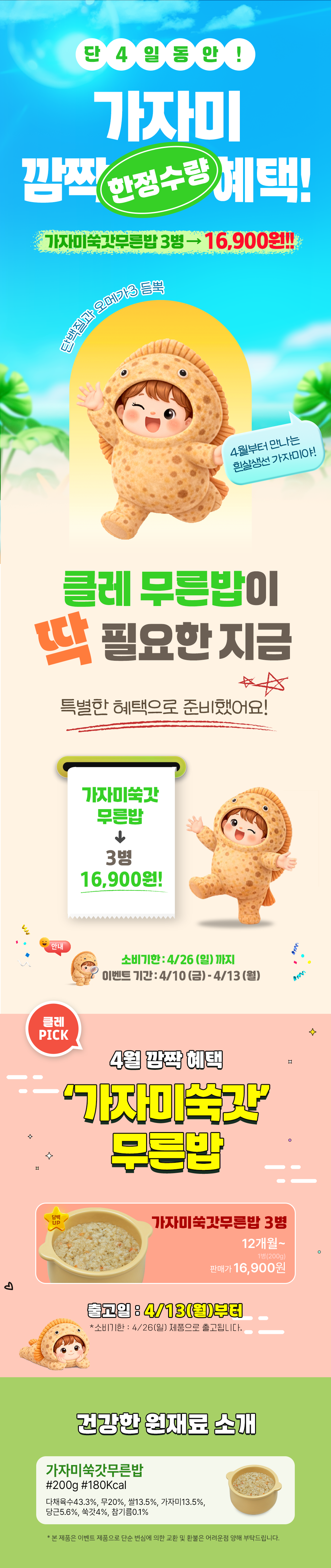 | 원재료명 및 함량 | [무른밥-가자미쑥갓무른밥]다채육수(정제수,다시마,무,양파,대파,마늘) 43.3% 쌀 13.5% 가자미 13.5% 무 20% 당근 5.6% 쑥갓 4% 참기름 0.1% |
