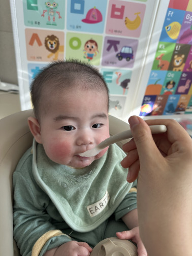 이유식 시작을 클레와 함께하고 있는 민준이입니다! 엄마들 사이에서 이미 맛있기로 소문나서 인지 처음 먹는 쌀죽인데도 냠냠 아주 잘 먹어줬어요! 숟가락까지 잡고 먹으려고 하더라구요 ^^ 처음 20ml로 시작해서 6일차 오늘 50ml까지 잘 먹고 있답니다. 내일부턴 초기1 식단으로 진행되는데 잘 먹는 아기 모습이 너무 궁금하네요! 클레 이유식 잘 먹고 건강하게 쑥쑥 커줬으먄 좋겠습니다